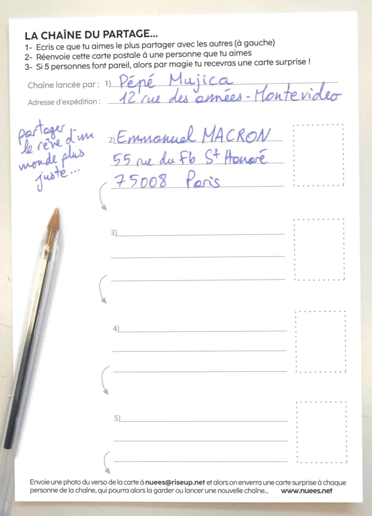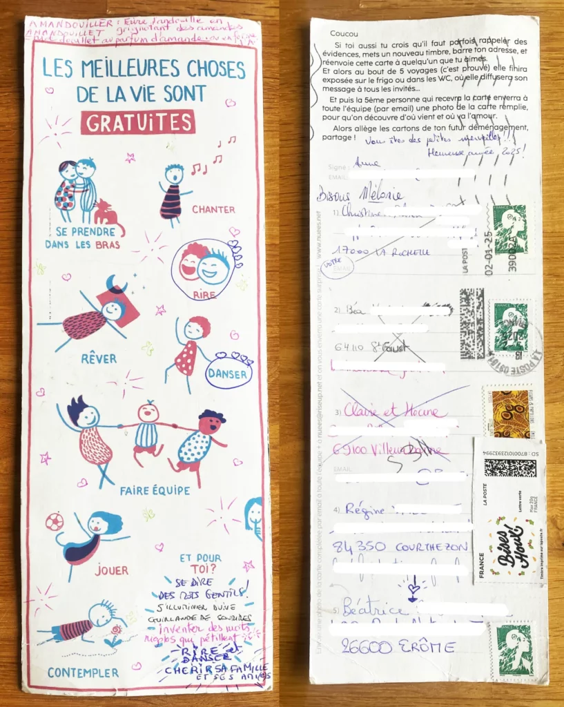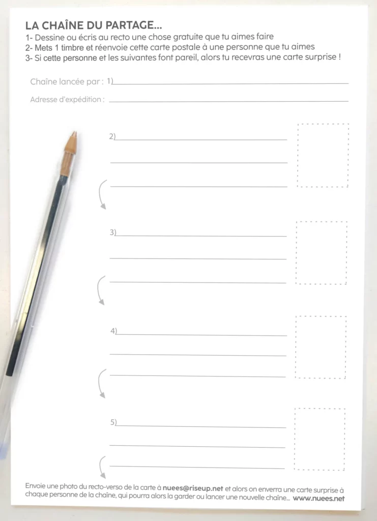 Nos cartes ‘repostales’ sont à envoyer à des proches qui pourront à leur tour les ré-envoyer pour créer des chaîne de lettres. Et si tout le monde joue le jeu, on envoie ensuite une carte surprise à chacune des personnes de la chaîne… qui peut alors la garder, ou relancer une chaîne!