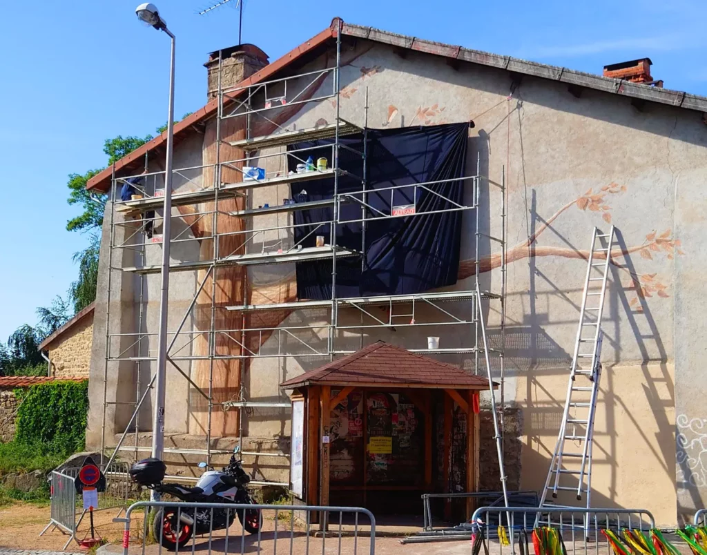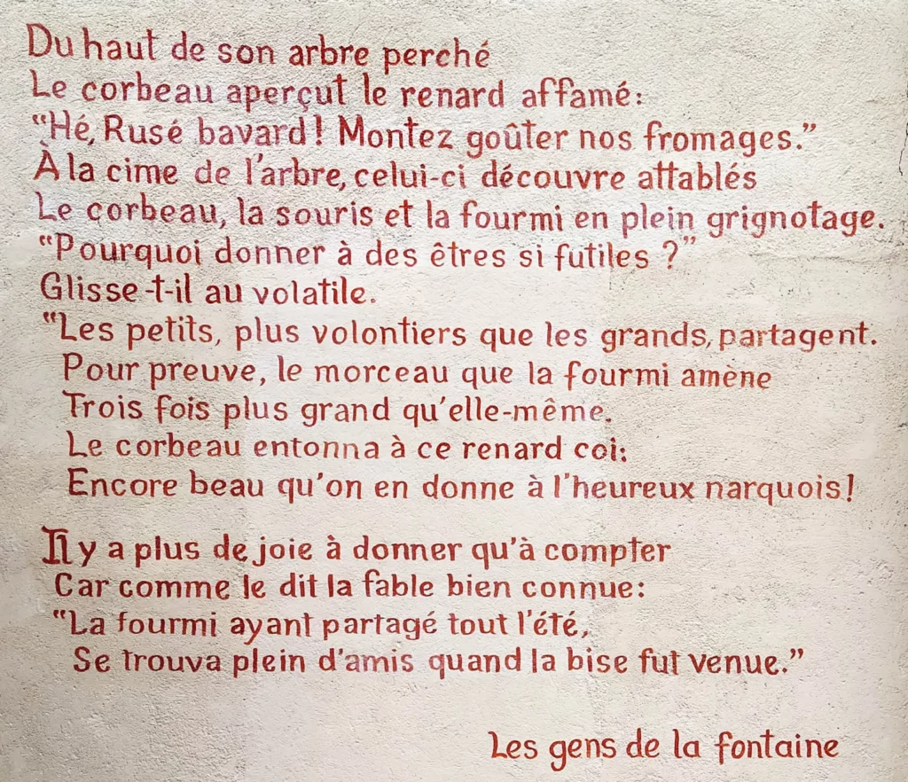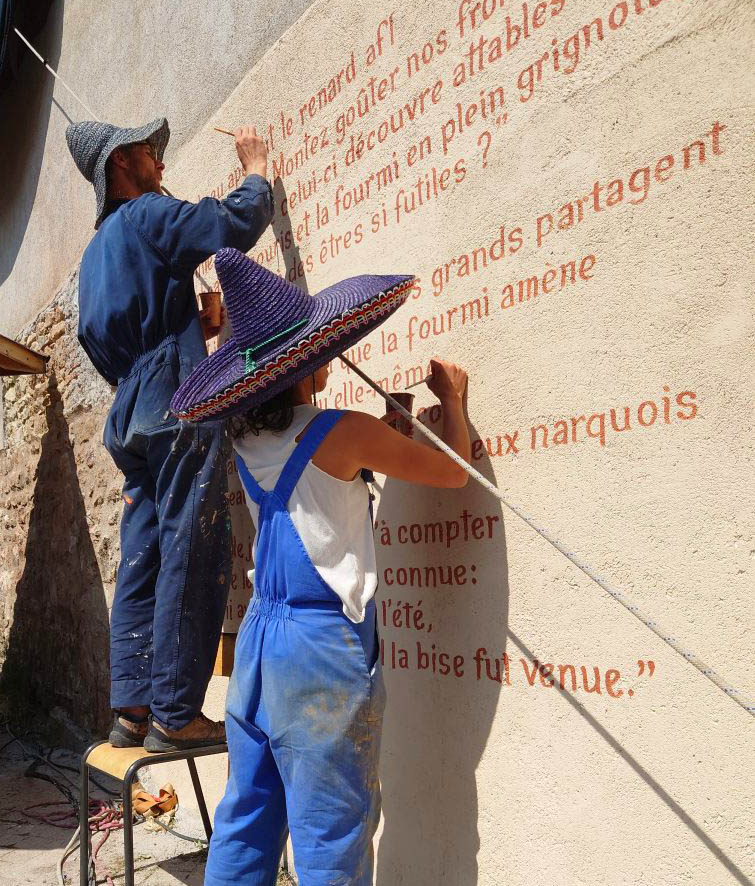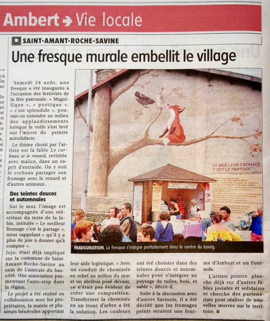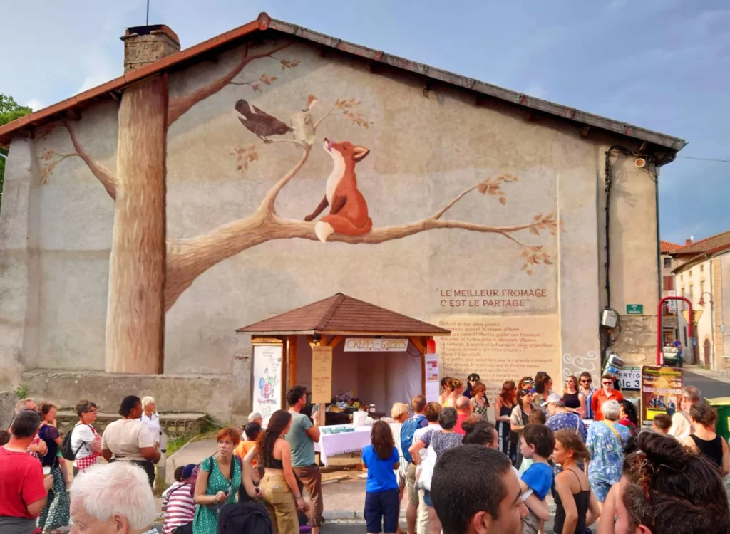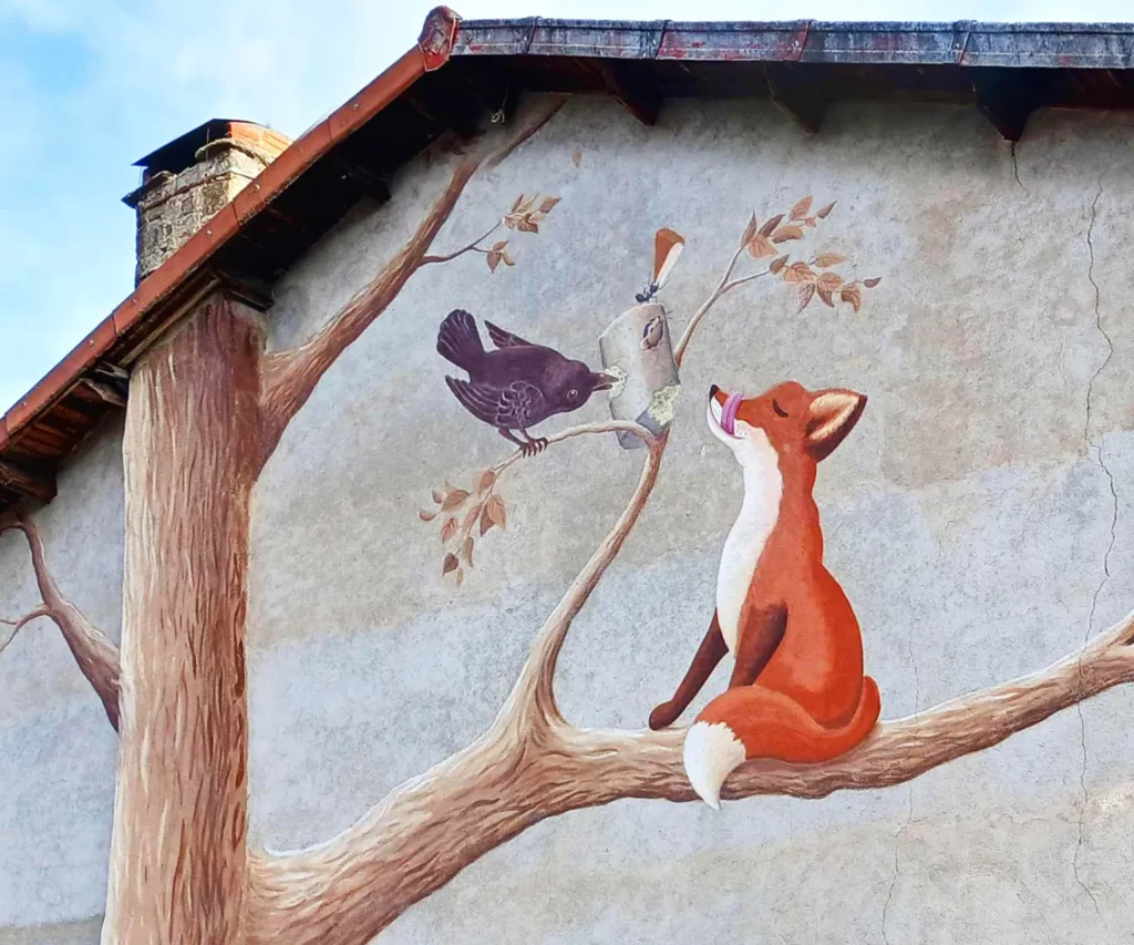 Des versions malicieuses et solidaires des classiques de la culture populaire. 1ère fresque peinte à Saint Amant Roche Savine, dans le Puy de Dôme à l’occasion de la Fête PaTroMale 2024, sur le thème du Corbeau et du Renard.